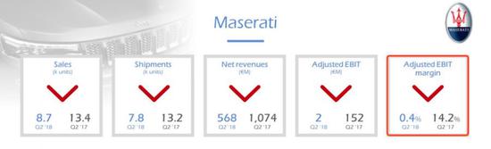 图片来源:FCA财报利润率方面,由于中国市场的糟糕表现,二季度玛莎拉蒂利润率从去年同期的14.2%降至0.4%。而今年第一季度,玛莎拉蒂的利润率为11.4%。