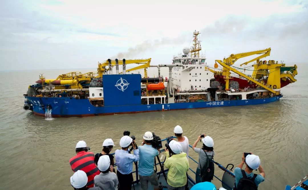具有中国自主知识产权的重型自航绞吸挖泥船“天鲲号”驶离位于江苏启东的船厂码头出港海试(6月8日摄)。 新华社记者 李响 摄