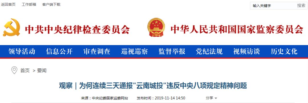 政知见(微信ID:bqzhengzhiju)注意到,11月14日,中央纪委国家监委官网刊发《观察|为何连续三天通报“云南城投”违反中央八项规定精神问题》一文。