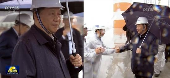 13日下午,习近平冒雨来到中集来福士海洋工程有限公司烟台基地。从《新闻联播》画面可见,当时雨情不小,路面湿滑,但总书记的车队依然行进在路上。
