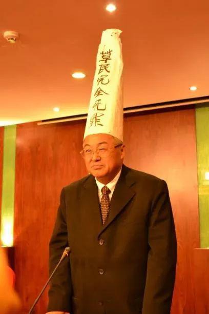 照片上,顾雏军带着一顶写着“草民完全无罪”的高帽。