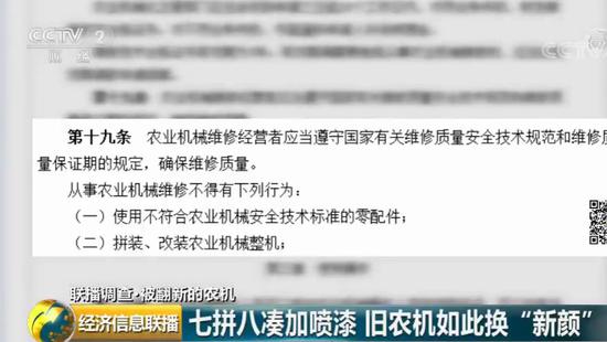 做个假铭牌,再根据假铭牌上的时间把农机简单维修保养一下,零件更是拆了东墙补西墙,而新旧程度也可以根据客户的要求做。这些翻新农机是怎样七拼八凑到一起的呢?央视财经记者对此进行了调查。