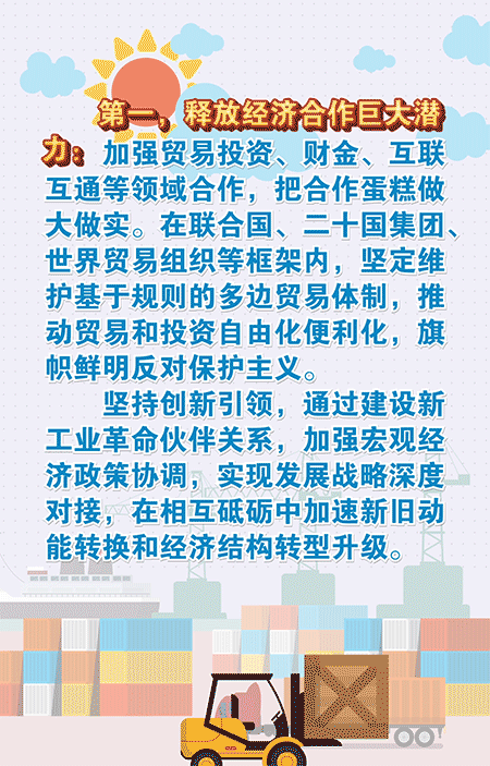第一,释放经济合作巨大潜力。加强经济合作、实现共同发展是金砖合作的初衷和主线,也是潜力最大、内容最丰富、成果最集中的领域。我们要加强贸易投资、财金、互联互通等领域合作,把合作蛋糕做大做实。要在联合国、二十国集团、世界贸易组织等框架内,坚定维护基于规则的多边贸易体制,推动贸易和投资自由化便利化,旗帜鲜明反对保护主义。