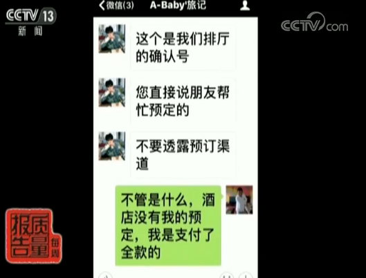 消费者 张先生:酒店前台根本就没有我的入住信息。酒店告诉我,需要一个9位数的订单号。我就联系去哪儿网,一两个小时以后去哪儿网方面给我打电话,叫我加他的微信。