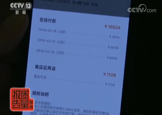 消费者 张先生:媒体报道以后,接到了一个去哪儿网的电话,说他是去哪儿网的负责人,他们做了一个所谓的处置,这是最高上限,那个口气很坚决。就是最后一天的房费6100块钱,做补偿退赔给我。我对这种赔偿方案除了无奈以外,我认为去哪儿网不太负责任,有点店大欺客。