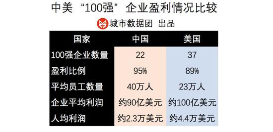 从平均利润来看,美国企业则全面领先:中国企业的平均利润约为美国企业的90%,人均利润则只有美国的一半(中国百强企业的人均利润约为2.3万美元,而美国的则达到了4.4万美元)。
