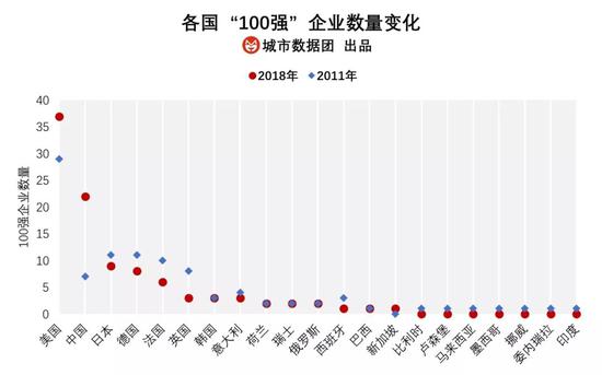 分别来看,从2011年到2018年间,美国的全球百强企业从29个增长到37个;而中国的全球百强企业则从7个增长到了22个,增长了3倍多。