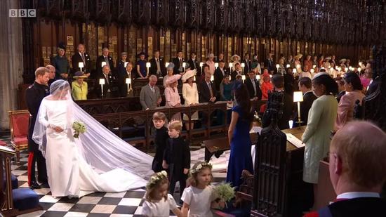 △新娘马克尔在母亲的陪伴下坐车前往教堂 (供图/视觉中国)这场婚礼中,英国王室成员悉数出席。威廉王子作为伴郎陪同在弟弟身边。凯特王妃和当花童的乔治王子和夏洛特公主抵达教堂,咖位最大的英国女王伊丽莎白二世身着淡绿色套装,和丈夫菲利普亲王压轴出场。