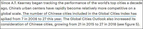 报告指出,在“全球城市指数”综合排行榜中,中国城市已从2008年仅有7个入榜,增长到2018年的27个城市入榜。