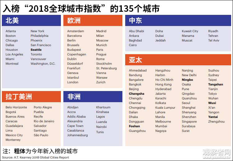 2018年进入榜单的135个城市,包括台北在内中国有27个城市。(图源:科尔尼“全球城市报告2018”,观察者网汉化)
