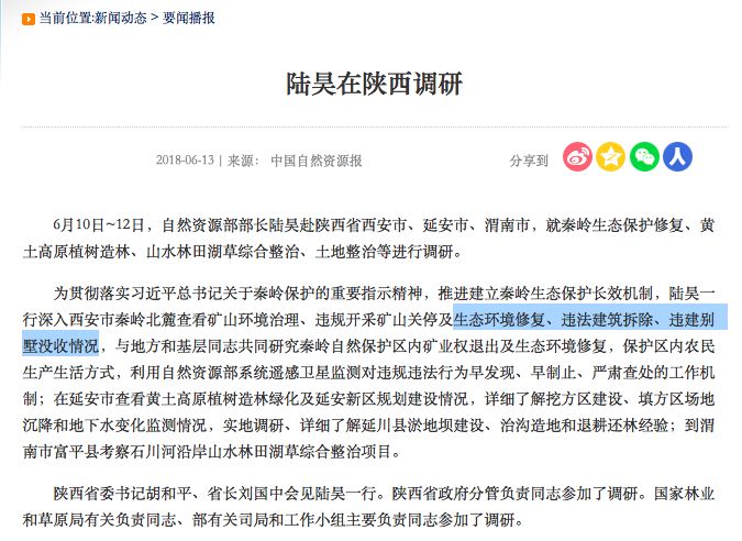 今年5月8日至11日,国家发展改革委曾组织赴陕西开展秦岭生态环境保护工作调研,一个月后(6月10日至12日),自然资源部部长陆昊赴陕西省西安市、延安市、渭南市调研,主题也是秦岭生态保护修复、黄土高原植树造林、山水林田湖草综合整治、土地整治。
