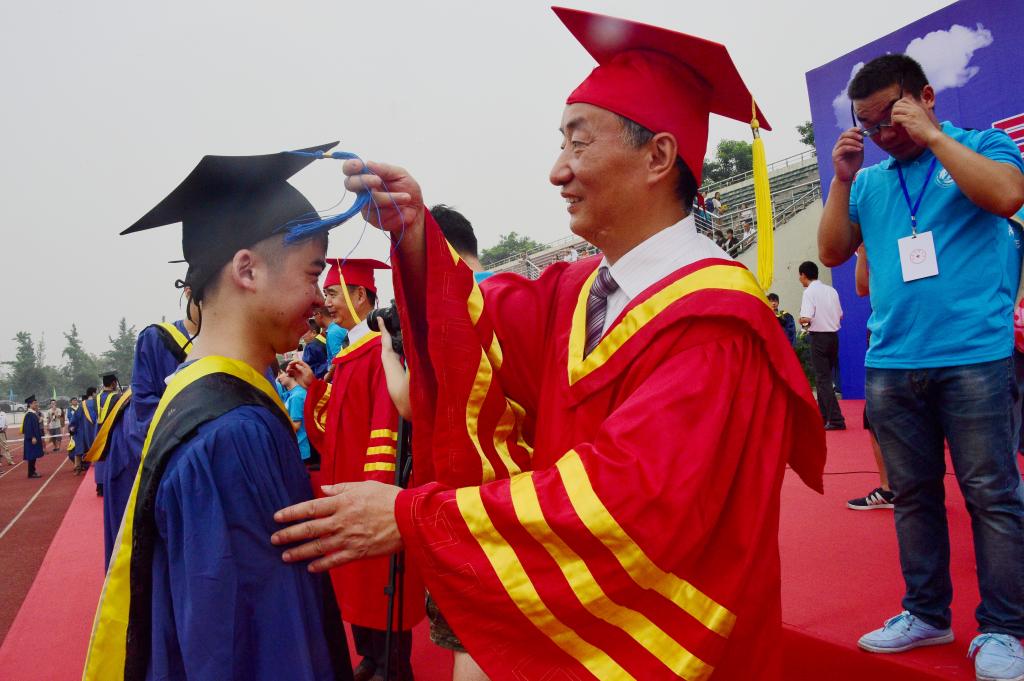 学位授予仪式上,校领导和导师们为本硕博毕业生一一拨穗,颁发学位证,并与每一位毕业生合影。