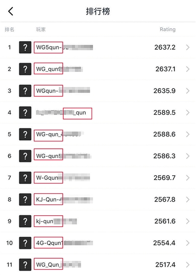仅11月7日官方发布的《绝地求生》游戏排行榜显示,位于该榜单前列的,几乎都是标有“WG-qun(外挂群)”字样的QQ群号。另外在一些游戏论坛、贴吧也随处可见卖外挂的QQ群号。