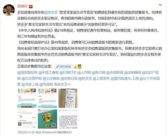 7月29日上午,童话大王郑渊洁在微博上表示,收到多位读者的举报,拼多多平台上某店铺销售盗版“皮皮鲁”系列图书,他已经向国家版权局和全国打黄扫非办公室举报。