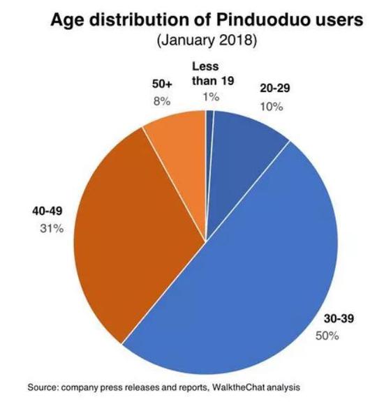 ▲图片来源:WalktheChat初期借腾讯获得流量入口,靠“低价拼团”爆发式增长的拼多多,捕获的便是大批三四线或者来自乡镇农村的中年人群。极光大数据显示,拼多多用户70%为女性,65%来自三四五线城市,来自一线城市的用户仅有7.56%。据walkthechat显示,拼多多的用户中,30-39岁的占到50%,40-49岁的占到31%。
