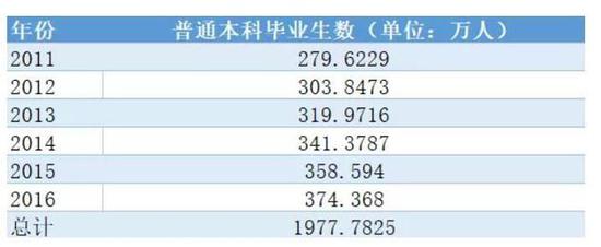▲数据来源:国家统计局2010年第六次人口普查数据显示,全国大学本科教育程度的有4563万人,研究生及以上学历的有414万人。另据国家统计局公开数据计算得知,2011年-2016年,全国普通本科毕业生数约1978万人。加总起来,截至2017年,中国教育程度为本科及以上的人共6955万,占全国总人口的5%。