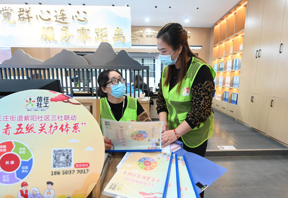 ↑福建省福州市晋安区王庄街道紫阳社区创新社区治理服务,建立以党建引领为主体的老年人关护体系,为社区老年人提供温暖的健康支持(2022年6月9日摄)。
