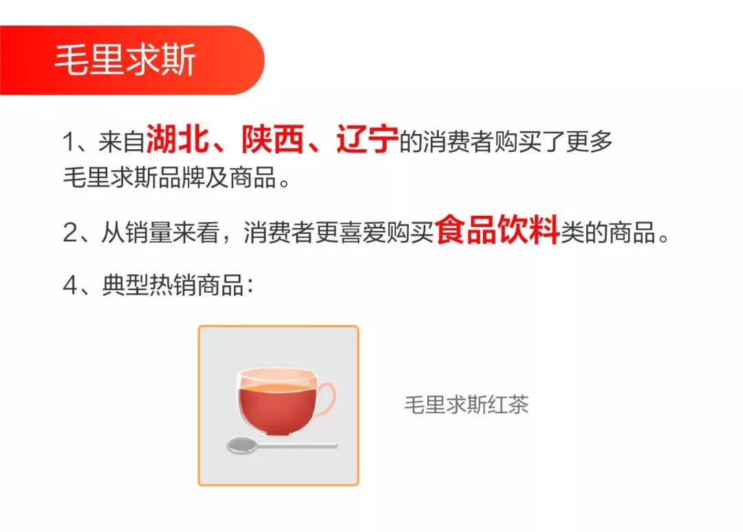最近,人民日报海外版联合京东大数据研究院做了一次研究,得出了一些有意思的结论,比如来自北京、广东、上海的消费者购买了更多巴西品牌及商品;来自湖北、陕西、辽宁的消费者购买了更多毛里求斯品牌及商品,最受欢迎的是毛里求斯的红茶,等等。