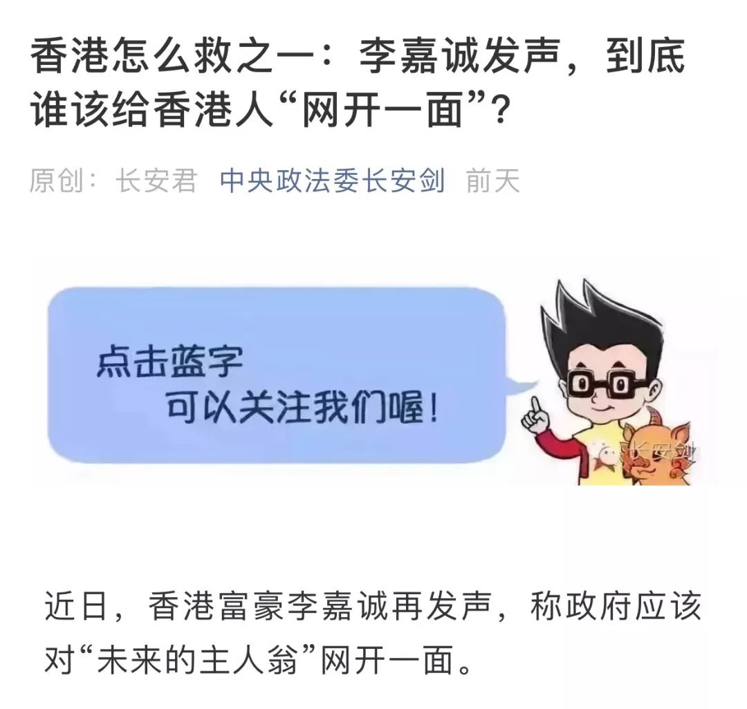 9月12日,中央政法委微信公众号“中央政法委长安剑”发表文章评论称:“李嘉诚发声,到底谁该给香港人‘网开一面’?”↓