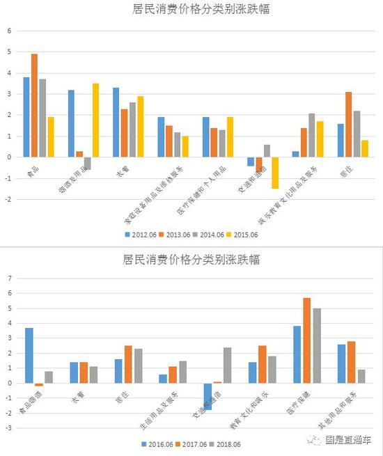国是直通车梳理了2012至2018年,每年6月份的CPI数据,2016年以前,居民消费八大类别中,食品、烟酒、衣着、家庭设备等消费价格涨幅排名靠前;2016年以后,医疗保健、教育文化和娱乐异军突起,成为涨幅最快的领域。