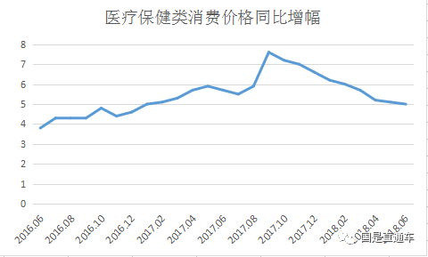 国是直通车梳理2016年6月至2018年6月医疗保健类消费价格同比涨幅情况,从2017年1月起,此类消费价格增幅站上“5时代”,增幅最高的月份是2017年9月,同比增幅7.6%。