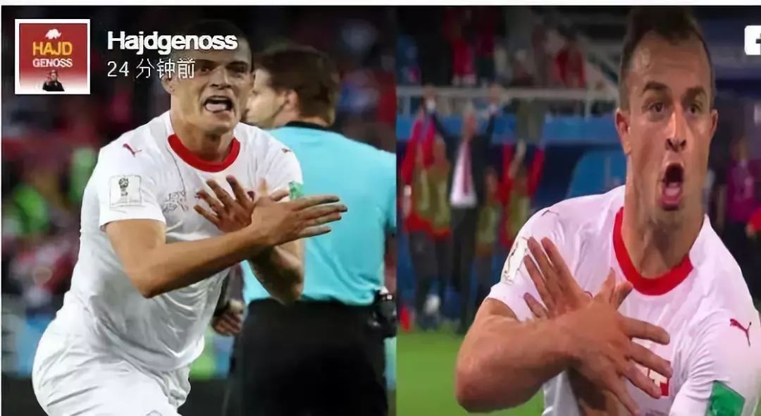 果不其然,在瑞士和塞尔维亚这“一战”前就产生巨大争议——毕竟, 瑞士的4名绝对主力哲马伊利、扎卡、沙奇里和贝赫拉米都是阿尔巴尼亚后裔。沙奇里是出生在科索沃的阿尔巴尼亚后裔 ,他和扎卡进球后,都做出了双头鹰的动作,表示阿尔巴尼亚在自己心中。