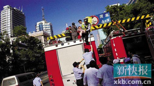 昨日下午1时40分许,新快报记者在现场看到,一名30岁出头的男子正跨坐在限高4.2米的龙门架上,胸前的背带绑着一名婴儿。虽然早已入冬,但广州昨日仍是艳阳高照,婴儿在日光的照射下不断扭动身体,显得非常不适。