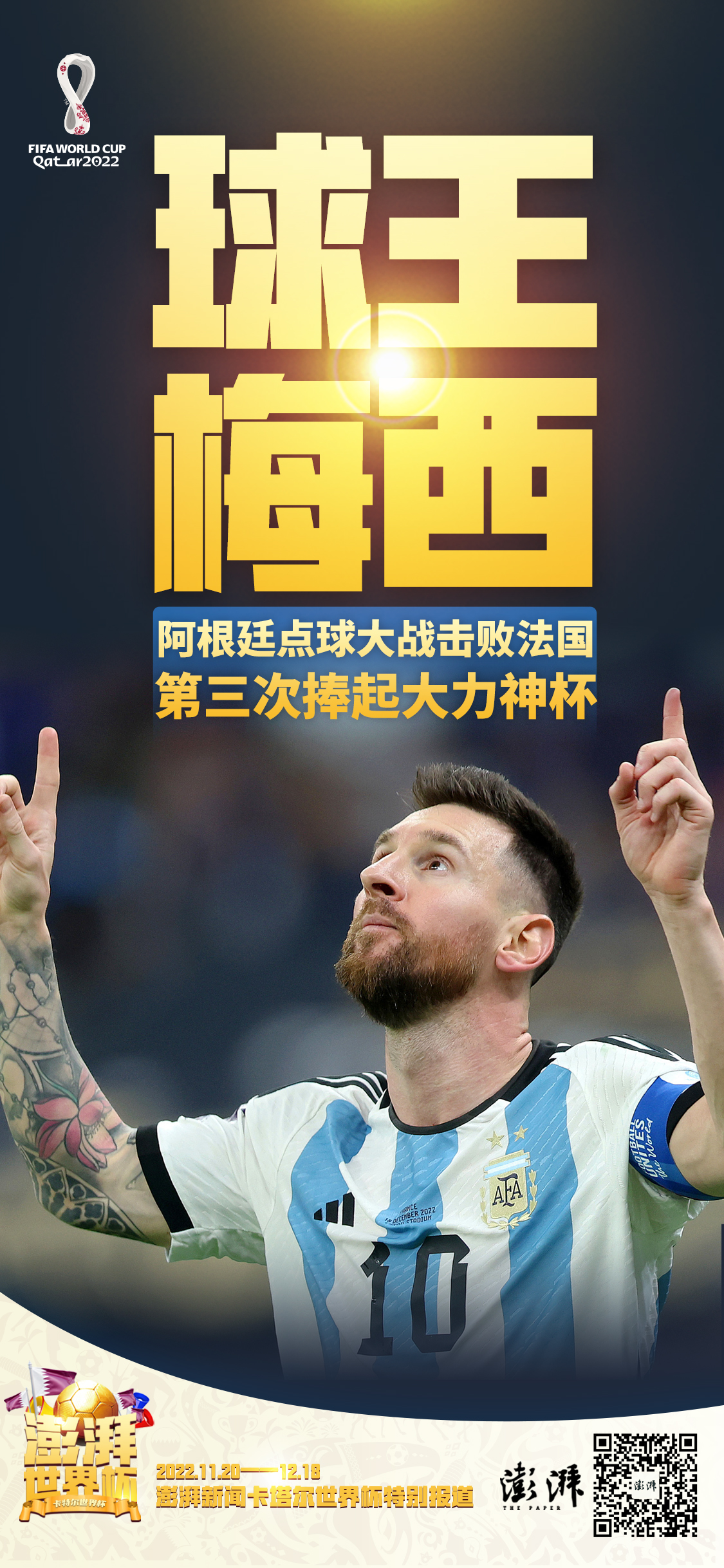梅西身披阿拉伯传统服饰,捧起大力神杯。当比赛尘埃落定的一刻,阿根廷球员们纷纷泪洒球场……而在捧起大力神杯之后,早已经在俱乐部层面拿下过所有顶级荣誉的梅西,也终于完成了加冕球王宝座的最后一块拼图。