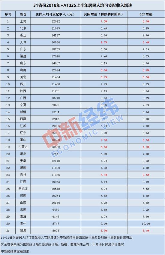 中新经纬客户端(微信公众号:jwview)通过梳理和计算发现,2018年上半年,上海、天津、海南、河北、重庆、内蒙古、吉林、甘肃等8省份居民人均可支配收入的实际增速超过了当地的GDP增速。其中,贵州居民人均可支配收入实际增速目前最高,达9%。