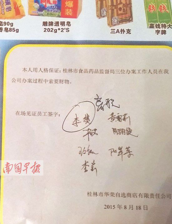早在8月18日,有7名目击执法人员拿财物的公司员工,认为执法人员在调查过程中索要财物的行为违法,就联名写了举报信,并交了一份给桂林市食品药品监督局。但举报没有结果,公司便将举报信登在了11月1日的超市海报上,称如果举报没有结果,还将继续登下去。