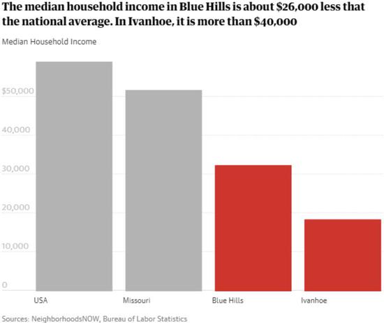 此外,Blue Hills社区中的家庭收入中位数要比全美国平均低26000美元,在Ivanhoe社区,这个差值达到40000美元以上。