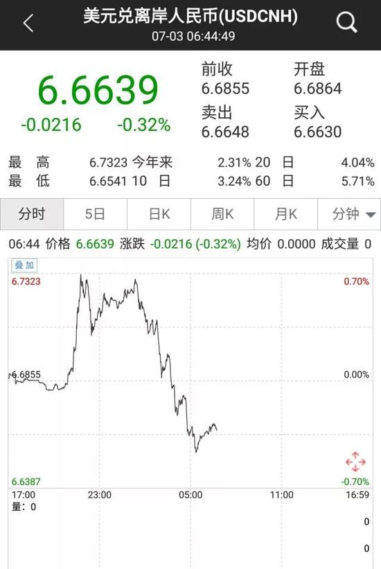 3日早间,离岸人民币兑美元一度跌至6.7323元,较前收盘价大跌近500个基点,并创了2017年8月8日以来的11个月新低。在潘功胜行长上述一席话发表之后,离岸人民币迅速反弹到6.7元附近,午后随着易纲行长接受中国证券报记者独家专访的消息挂网,离岸人民币展开强势反攻,从6.73元一路涨到最高6.65元附近,截至北京时间18:44,最高至6.6541元,较日内低点反弹近800个基点。