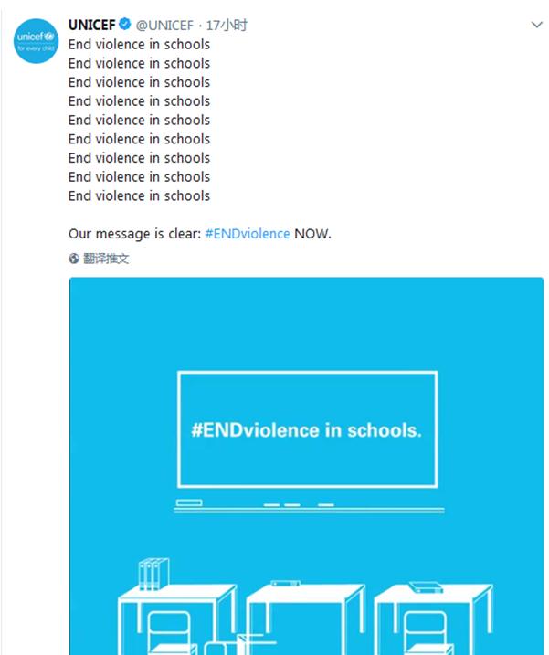 儿基会推特称:“我们的意思很明确,结束校园暴力,现在!”