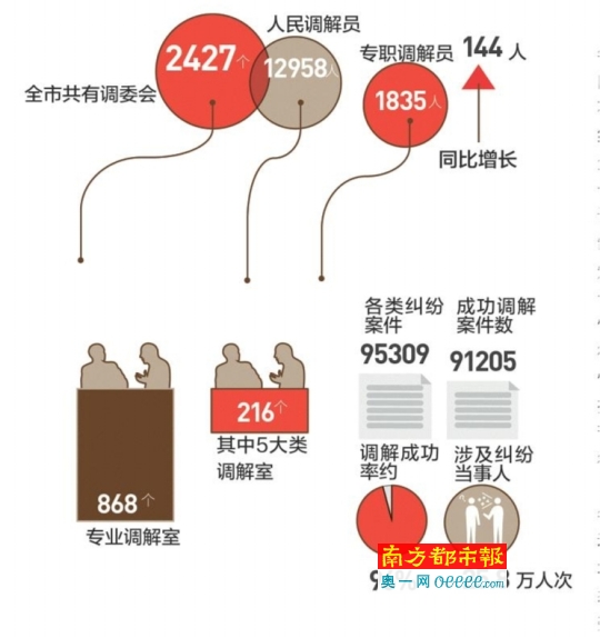 昨日下午,2016年人民调解宣传月启动仪式在东门文化广场举行。南都记者获悉,目前全市共有调委会2427个,人民 调解员12958人,其中专职人民调解员1835人,同比去年增长了144人。专业调解室868个,比去年多了133个,其中5大类调解室共有216个。 去年至今年4月份全市共参与调解了各类纠纷案件95309宗,成功调解案件数为91205宗,调解成功率约占96%,涉及纠纷当事人25.8万人次。