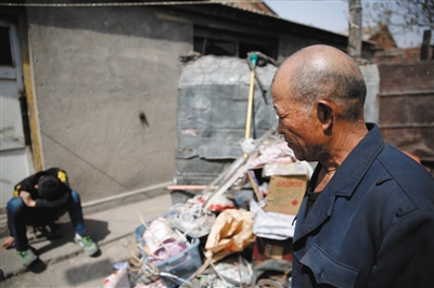 这十年间,张道平带着孙子张远远住在天津市北辰区西堤头村。这个只有9 平米的房子,已经被废旧电器、瓶瓶罐罐、废纸团团围住。阴暗潮湿的房间里,除了一张床,只能放得下一张桌子。张道平说,村民觉得爷孙俩可怜,常会把一些废旧品给他,他整理整理,再卖给收废品的。