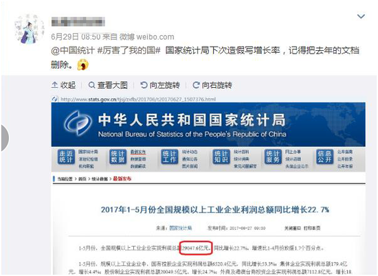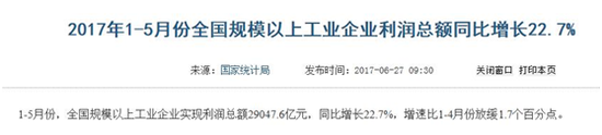 而去年此时,即2017年6月27日,国家统计局发布的数据显示,2017年1-5月份,全国规模以上工业企业实现利润总额为29047.6亿元。