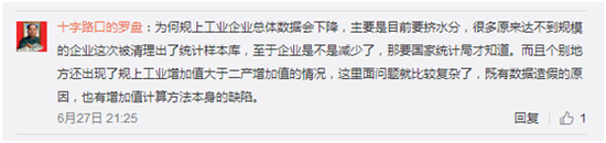 对此,网友十字路口的罗盘留言认为:规模以上工业企业总体数据会下降,主要是要挤水分,很多原来达不到规模的企业这次被清理出了统计样本库。他认为,这里面问题就比较复杂,既有数据造假的原因,也有增加值计算方法本身的缺陷。