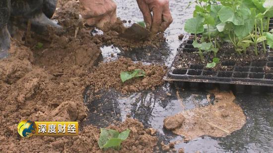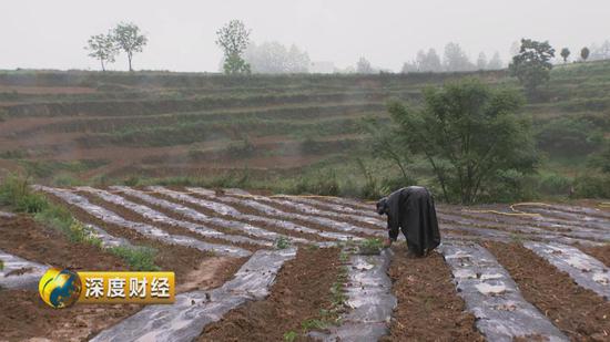 农户丁勋的地里堆放着刚刚买的黄瓜苗,趁着雨水充足要抓紧把黄瓜苗种下去。