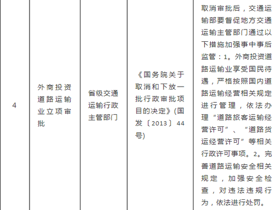 原标题:国务院:取消外商投资道路运输业等11项行政许可事项