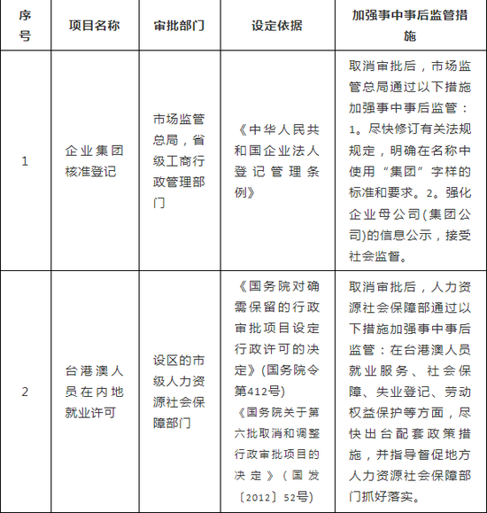 经研究论证,国务院决定取消11项行政许可等事项,现予公布。另有6项依据有关法律设定的行政许可事项,国务院将依照法定程序提请全国人民代表大会常务委员会修订相关法律规定。对取消的行政许可等事项,相关部门要制定完善事中事后监管细则,自本决定发布之日起20个工作日内按规定向社会公布,并加强宣传解读、确保落实到位。
