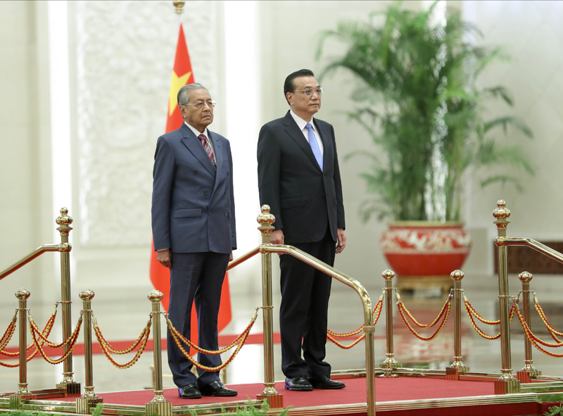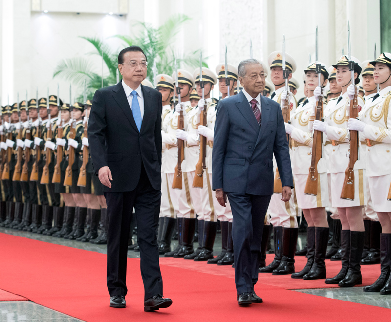 国务院总理李克强8月20日上午在人民大会堂北大厅举行仪式,欢迎马来西亚总理马哈蒂尔对华进行正式访问。