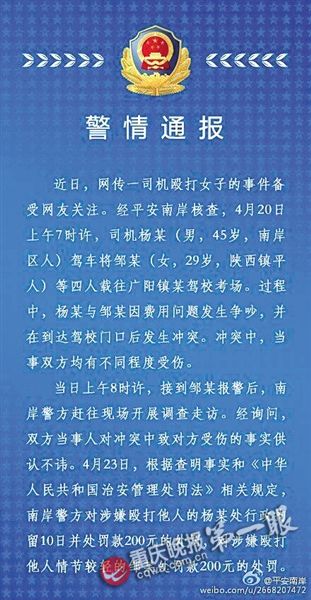 ▶警方发布的警情通报昨日,重庆晚报A05版刊登《女子招来Uber专车 没想到司机很暴力》一文,引起众多读者讨论。昨日,南岸区警方官方微博“@平安南岸”公布了案件处理结果:涉嫌殴打他人的Uber专车司机杨某(男,45岁,南岸区人)处以行政拘留10日并处罚款200元的处罚,对涉嫌殴打他人情节较轻的邹某处以罚款200元的处罚。