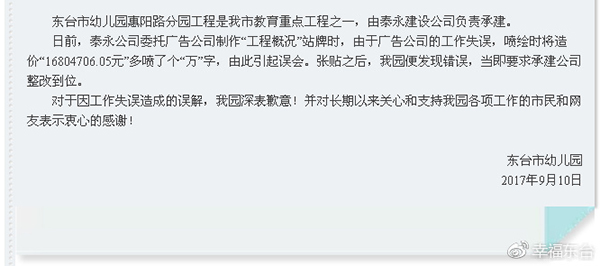 9月10日,我们在工作中发现部分微博、论坛及微信公众号在传播内容为“东台要建最牛幼儿园?造价高达1600多亿!”的贴文。10日晚,东台市幼儿园作出如下情况说明: