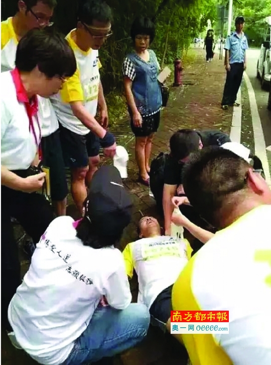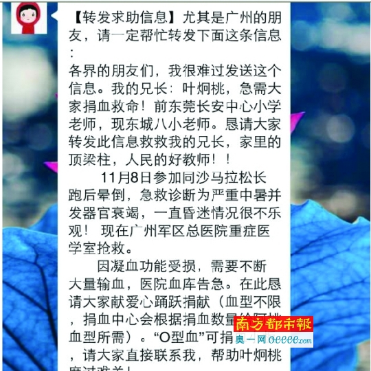 南都讯 记者韩成良 “[救命]这位好老师性命垂危,急需你的帮助”!前天上午,长安镇政府官方微信平台发布这样一则信息,一天阅读量超过2万。本 月8日,东莞一场马拉松比赛中,一名小学男教师参赛过程中突然晕倒,被诊断为急性中暑,大量出血不止。这名老师曾在长安从教十年,政府官方微信公众号发出 的这条求救信息得到热心人广泛响应,仅昨天上午就有30余人到广州的医院捐血。