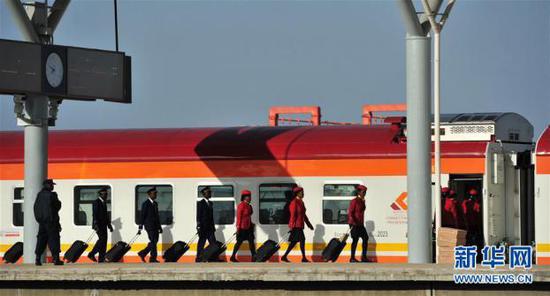 2017年6月9日,在肯尼亚蒙内铁路内罗毕南站,乘务员登上列车。蒙内铁路全长约480公里,2017年5月31日正式通车,6月1日开始客运服务。每天运行一对往返蒙巴萨与内罗毕的列车。图片来源:新华社基础设施方面,中国帮助非洲建设了一批公路、铁路、机场、港口……2017年5月31日通车的蒙内铁路是落实中非“十大合作计划”的重要成果,也是中非“三网一化”和产能合作的标志性工程。肯尼亚总统乌胡鲁·肯雅塔在视察蒙内铁路建设时说:“蒙内铁路将带领肯尼亚开启工业化进程,实现经济转型。”