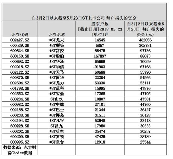 此外,自3月2日以来截至5月23日,受退市风险加大的影响,A股有86只ST股票的市值跌去18%。67家市值下降的ST公司涉及股东户数达340万户,以此计算,平均每户股民浮亏3万元。