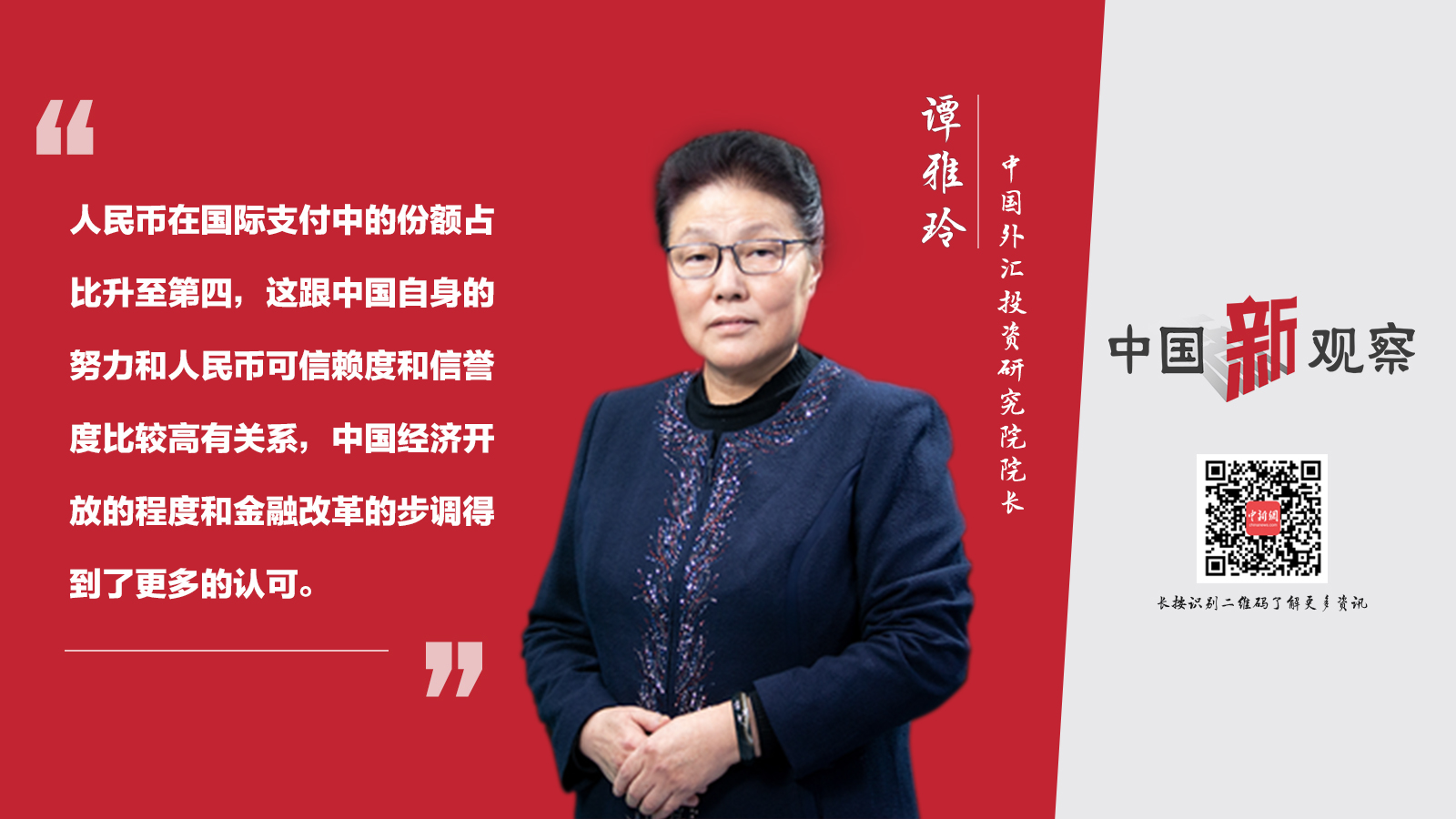 谭雅玲:人民币在国际支付中的排位升至第四,这只是人民币国际化的一小步,而不是说人民币国际化已经来临。我们需要保持平和的心态,客观、理性地来全面看待这种变化。
