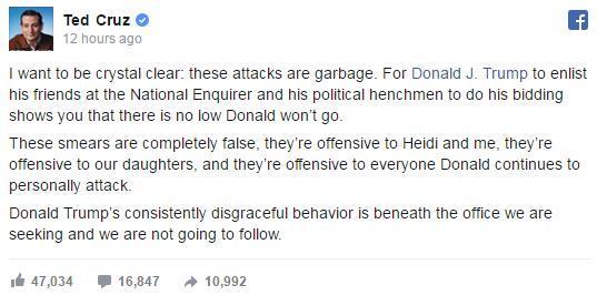 然后,事情就彻底包不住了。克鲁兹在节目结束不久就立即发布声明,痛斥《国家问询报》的报道,并直指特朗普。