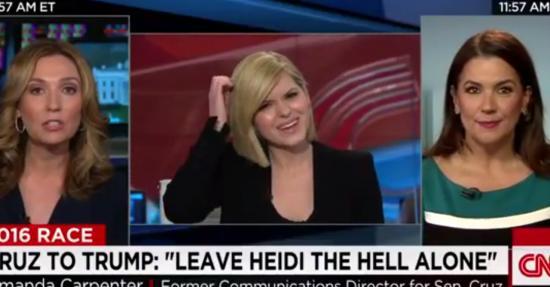 当 天中午,节目嘉宾、特朗普支持者、《波士顿先驱报》专栏作家和电台主持人爱莉安娜·科恩(Adriana Cohen,图右)公开提到上述报道,称克鲁兹和他的前公共关系总监阿曼达·卡朋特(Amanda Carpenter)发生过不正当关系,而阿曼达·卡朋特当时就!在!参!加!直!播!(图左)