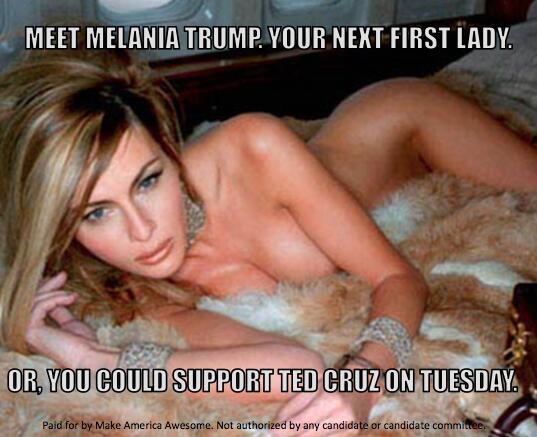 22日,美国三个州将展开共和党初选。前一天,反特朗普的超级政治行动委员会“让美国变得了不起(Make America Awesome)”发布了特朗普超模妻子的旧裸照,“看看梅拉尼娅,你们下一位第一夫人。不想的话,周二(22日)支持克鲁兹吧。”